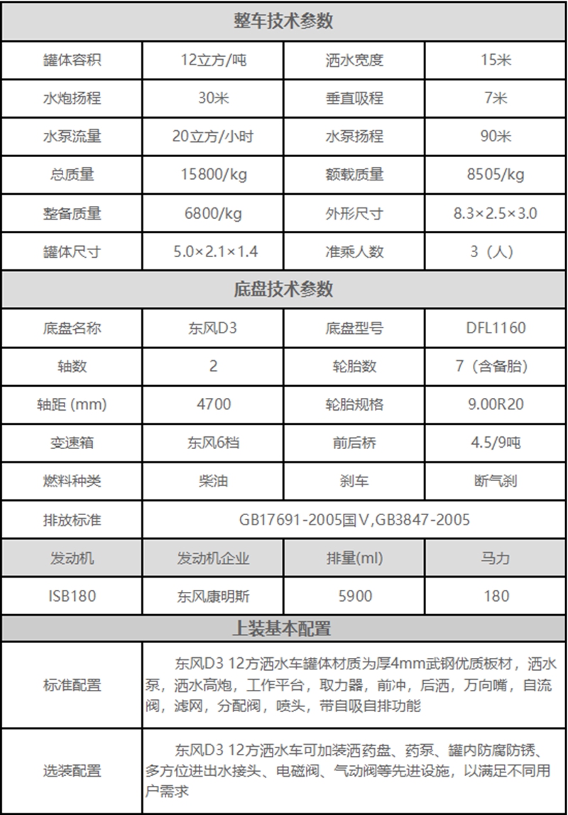 國(guó)六東風(fēng)D3系列12-15方灑水車,底盤(pán)型號(hào):DFV1163GP6DJ, 陜齒小八檔(8JS85E),發(fā)動(dòng)機(jī)采用康機(jī)D4.0NS6B195 (4缸發(fā)動(dòng)機(jī)),國(guó)六排放,前橋2.8T,后橋8T,9.00鋼絲胎(9.00R20)ABS,原廠空調(diào)、氣 囊座椅、多功能方向盤(pán)、MP5、行車記錄儀、中控門(mén)鎖帶遙控鑰匙。上裝:罐體采用標(biāo)準(zhǔn)Q235 碳鋼制作,罐體自動(dòng)焊,配大功率專用灑水車,可自吸自排,前沖后灑,側(cè)噴,高位花灑,主 管道加粗,大通徑球閥,直通球閥式消防接口,帶后工作平臺(tái),沖孔平臺(tái),帶高炮。