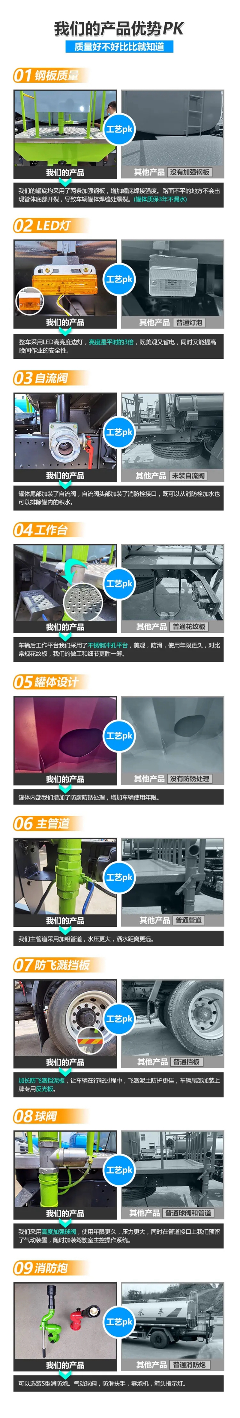 東風天錦12噸灑水車罐體采用4mm厚武鋼產專用容積板制作,采用機器壓板一次性成型技術,采用先進旋邊機,罐體包罐機工藝保證了罐體制作的精度和美觀。公告標準容積11.6立方米(可按用戶訂做12-15立方),罐體內采用先進的對接焊技術,罐體焊后采用噴丸漏檢測,使罐體具有強度高、重心穩,車輛運載安全平衡等特點。配備全國質量評比第一名的杭州威龍(日本技術)大功率專用灑水泵。前沖(噴),后灑,帶側噴,后置工作平臺,平臺上安裝綠化灑水高壓炮(炮噴射形狀可調成直沖狀、大雨、中雨、毛毛雨、炮可360度旋轉,射程>35米)。帶自流閥,消防接口。帶自吸泵,可將池塘的水直接吸入罐體內也可直接從城市街道消防栓上連接注水,吸入罐體內。罐前量管(觀察罐內水位)、罐后爬梯、罐上罐口帶簡易護欄、罐側雙炮筒、6米長4寸鋼絲塑膠管兩根,罐體表面雙層油漆工藝,防銹、耐腐蝕,其余有廠家標配??蛇x擇加裝加裝藥盤、氣動控制閥、噴藥設備、罐內防腐等。灑水車也可做噴藥車使用,可根椐用戶要求進專業噴藥防腐處理,也可做企業單位運水用,緊急時可做消防車使用。