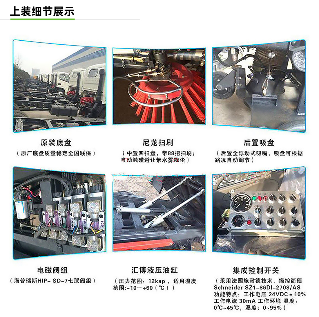 東風小多利卡5方吸塵車專用配置:塵箱:4立方米,水箱:1立方米;中置吸盤、江鈴五十鈴副發動機、施耐德控制開關、海普瑞斯電磁閥組、無級變速自動離合器、免維護離心式風機、高精度垃圾箱過濾系統(最高可達0.5微米),不銹鋼垃圾箱、進口脈沖閥、垃圾箱舉升自卸、尾部LED箭頭燈、車尾霧狀噴水潤濕功能、倒車影像、手動泵應急系統。