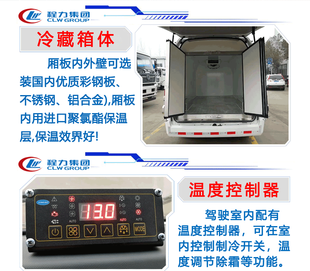選裝冷機:可根據客戶的用車需求選擇不同的機組,客戶可選-5°C、-10°C、 -15°C、-18至20°C冷藏機組, 冷藏機組品牌有國產勁達K牌、韓亞、漢雪、華泰、松寒、凱雪等冷藏機組,進口冷藏機組品牌有:美國開利、美國冷王.冷藏機組分為獨立機組和分體機組!